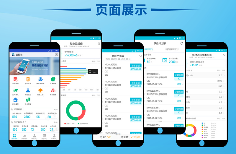 我们紧跟时代发展,现推出6款移动办公应用软件:云砼途单站版、云砼途集团版、云砼途司机端、云砼途工地端、云砼途供应商版、云砼途质检员版。完全可以实现业务员移动端随时随地办公,利用碎片化时间提升工作效率;财务人员移动端进行风险管控,工作审批;领导层移动端实时查看站内生产经营数据,将企业情况紧抓手中。利用手机的移动信息化软件,建立手机与电脑互联互通的企业软件应用系统,摆脱时间和场所局限,随时进行随身化的公司管理和沟通。