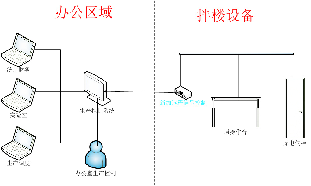 通过对中控系统的改造,建立搅拌站集中生产调度中心,生产电脑通过网线连接物料秤采集模块、输入输出模块,保留搅拌楼原有控制系统,同时在楼下生产调度中心新增远程操作控制系统(保留手动切换能力)和应急开关(急停),日常生产中,生产、质检、实验室人员可在集中办公中心集中办公、远程控制搅拌楼生产,发生紧急情况时,可通过应急开关中断生产、排除故障。