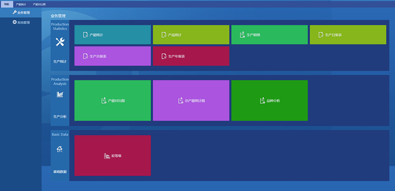 主要包含:产能统计,产品统计,生产明细,生产日报表,生产月报表,生产年报表;产能对比图,总产能统计图,品种分析等。